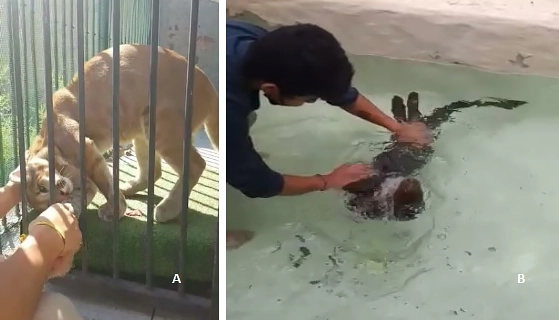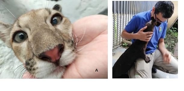 Figura 1: Addestramento per non mordere le mani dell'assistente per avere un approccio migliore e facilitare i diversi tipi di cure di cui ha bisogno durante tutta la vita, A Puma concolor, B Pteronura brasiliensis.