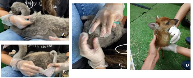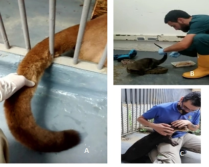 Figura 1: Partecipazione volontaria a diversi processi per raccogliere campioni o valutare il loro stato attuale. A e B Desensibilizzazione della coda per facilitare il prelievo di sangue in Puma concolor e Lontra longicaudis, C Valutazione del corpo in Pteronura brasilien.