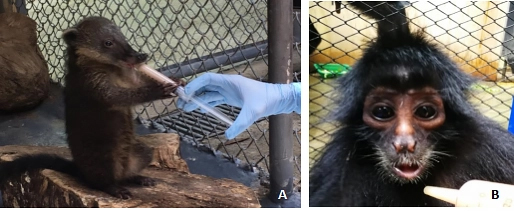 Figura 3: Desensibilizzazione tramite siringa a diversi sapori che preparano gli animali alla somministrazione del farmaco, consentendo loro di collaborare volontariamente con le diverse cure e rafforzare la relazione caregiver-animale. A: Nasua nasua, B: Ateles fusciceps.