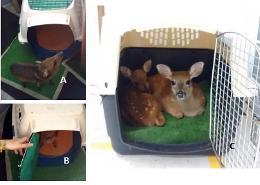 Figura 5: Ingresso al box di trasporto (guacal o canile), A e B Pecari tajacu C Odocoileus virginianus.