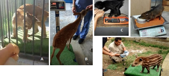 Figura 6: Implementazione della pesatura con rinforzo positivo da uno stadio sensibile A: Puma concolor, B: Odocoileus virginianus, C: Ateles fusciceps, D: Pecari tajacu, E: Tapirus pinchaque. Un solido inizio di una storia di condizionamento basata sul rinforzo positivo e su una relazione addestratore-animale è fondamentale nella cura degli animali.