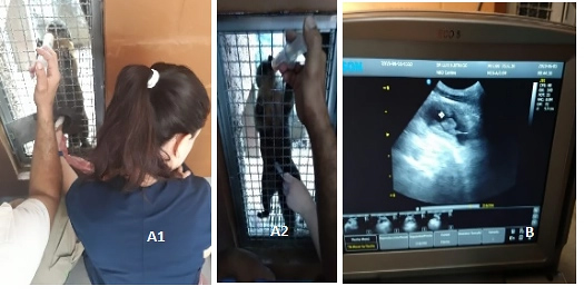 Figura 7: Coatis, addestrato a partecipare volontariamente a procedure di esame fisico, come orecchio, occhi e bocca, valutazione delle condizioni corporee, misurazione della temperatura, auscultazione, pesatura ed ecografia. Gli animali condizionati appaiono comunemente fiduciosi e pazienti, il che facilita questi tipi di procedure A1 e A2 test per immagini diagnostiche, B Ecografia di Nasua nasua.