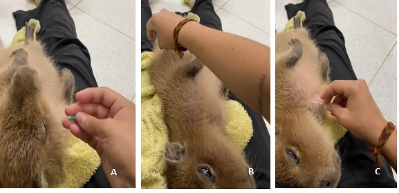 Figura 8: A, B e C Assuefazione e progressiva desensibilizzazione al contatto con un ago a punta smussata in Chigüiro Hydrochoerus hydrochaeris.